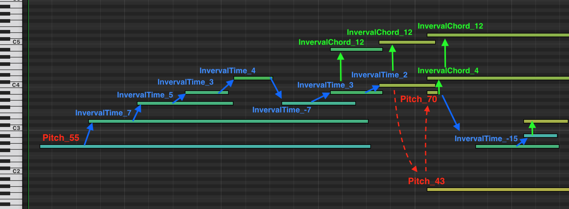 Below is an example of how pitch intervals would be tokenized, with a max_pitch_interval of 15.