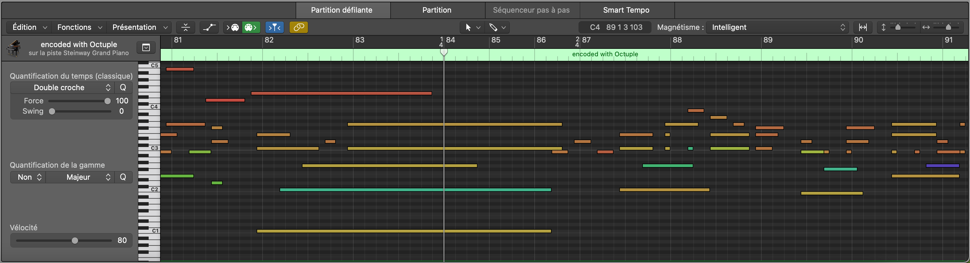 ²: using time signatures with miditok.Octuple might result in time alterations, as the time signature changes are carried with the note onsets. An example is shown below.